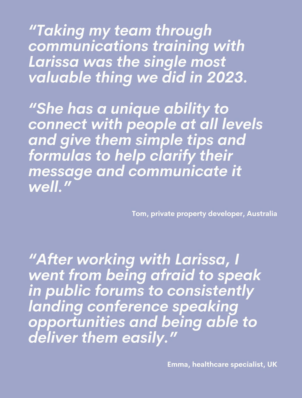 Hello, I'm Larissa - and I help people unlock value through better communication.Communication is the critical work and life skill that we're rarely taught. Having spent 20 years helping people communicate better, I'm convinced it's the simplest way to set yourself apart. And it's a skill that everyone can improve.Effective communication in the 2020s looks vastly different: times have changed.
